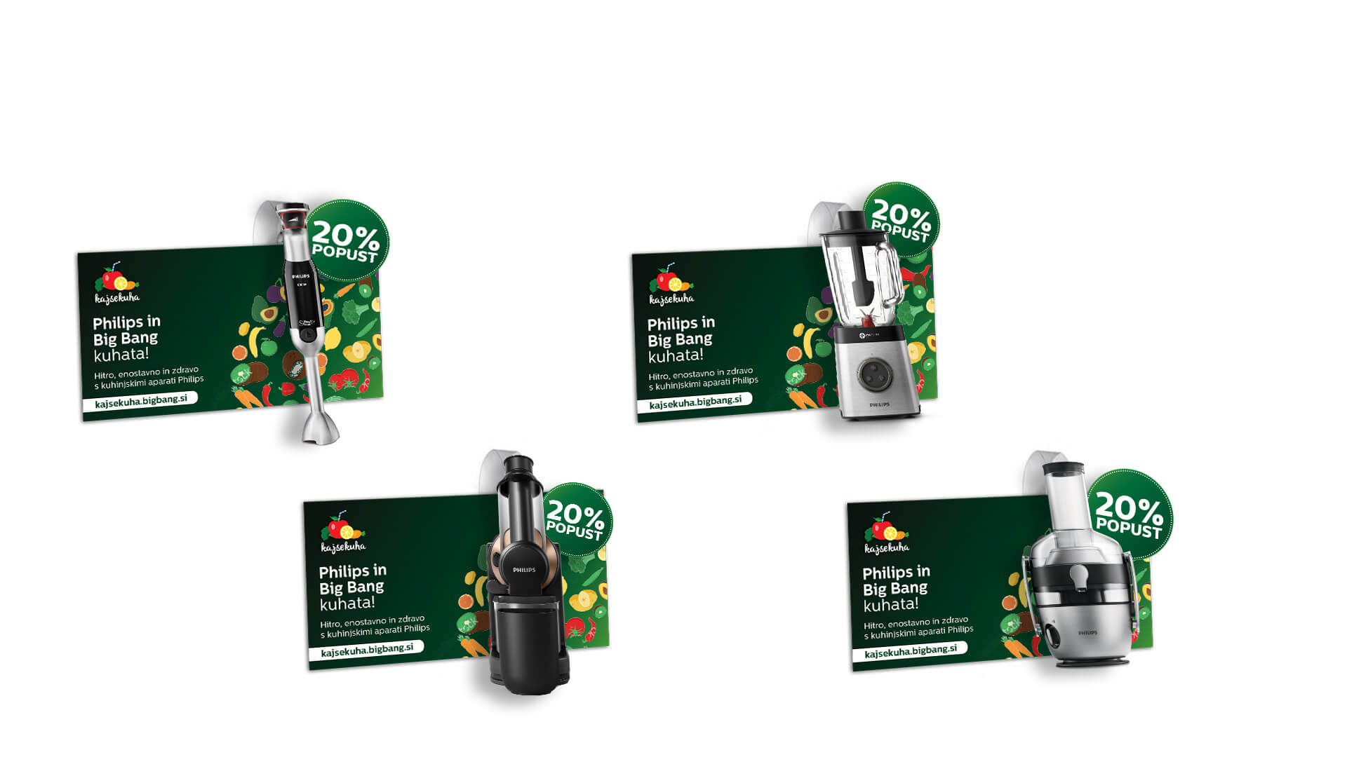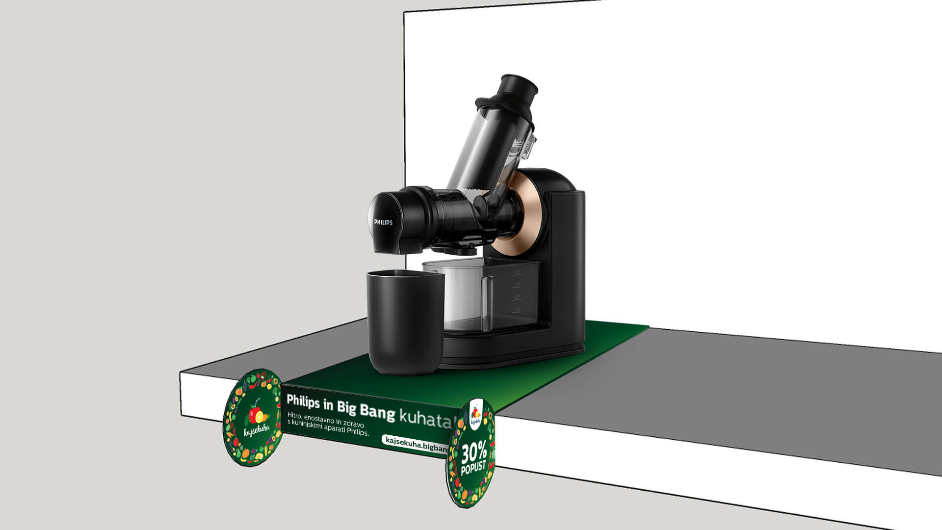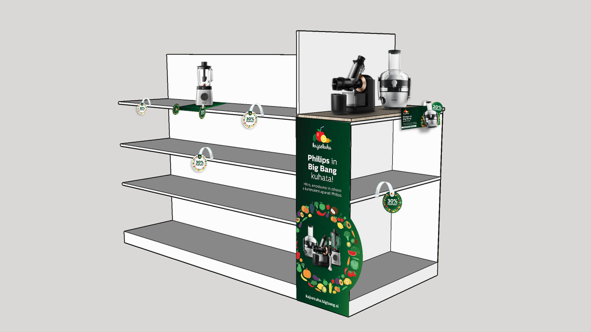 Število ogledov je bilo več kot zadovoljivo, a ne le to, iz dneva v dan se je povečevalo, brez dodatnih vložkov, kar zgovorno priča o kakovosti vsebine. Projekta Kaj se kuha smo se lotili skupaj z našim naročnikom, družbo Philips, in trgovcem Big Bang. Ker smo se zavedali pomembnosti instore aktivacije, smo s ključnimi promocijskimi materiali aktivirali tudi prodajne police. Tako smo kampanjo z digitalnih platform razširili še na mesto nakupa in še izboljšali njeno učinkovitost.